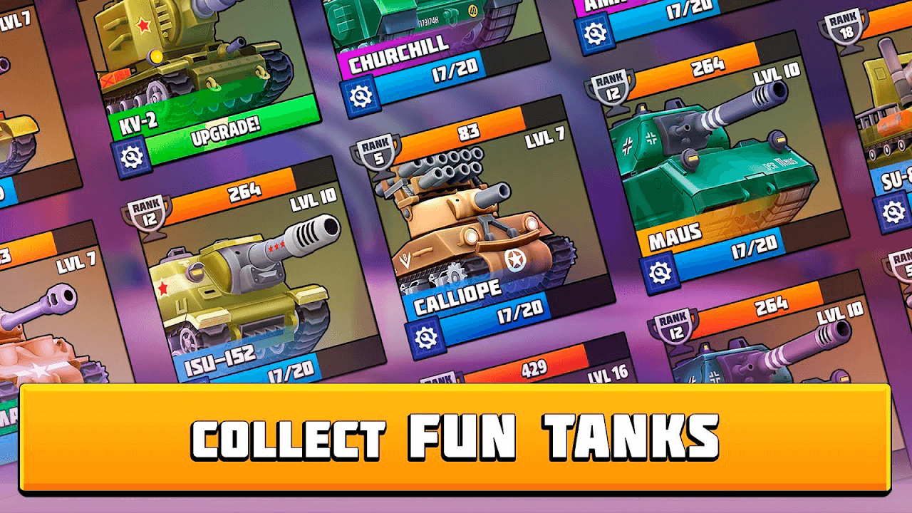 Enjoy 3 minutes full of FUN battle modes in fancy tanks! Legendary World War II tanks in a casual style! MAUS, KV-2, T-34, SU-8 and experimental tanks are ready and waiting for the battles to begin! Collect rare cannons and engines and level them up to customize your tank and boost its Super abilities.