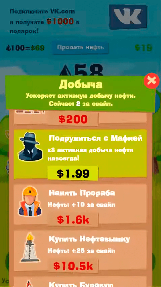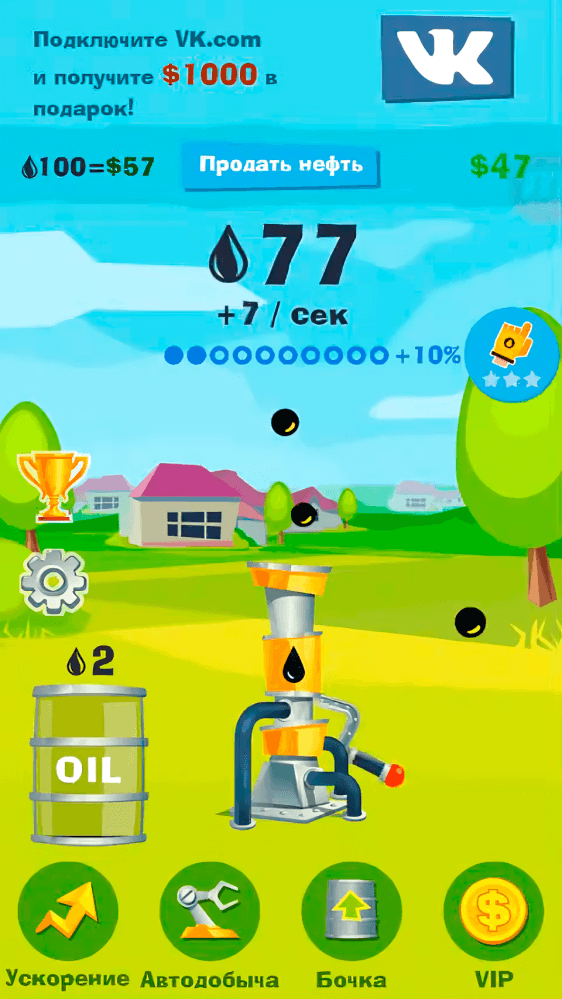 Join the fight and pull the lever to get more and more oil! Sell oil for dollars and develop your business. Watch the dollar exchange rate and sell oil on time. Pump oil even when the app is turned off, buying improvements for the oil pump!